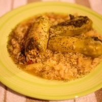 Stuff your zucchini with the rice mixture you prepared earlier. Place in your pan and cover with water, more lemon, olive oil, salt, dried mint and a bunch of garlic cloves. Add the insides of the zucchini you pored out as well. Once the water starts boiling reduce to low heat, cover and cook for around an hour. You already fucked up the hollowing out part, don’t fuck this up.